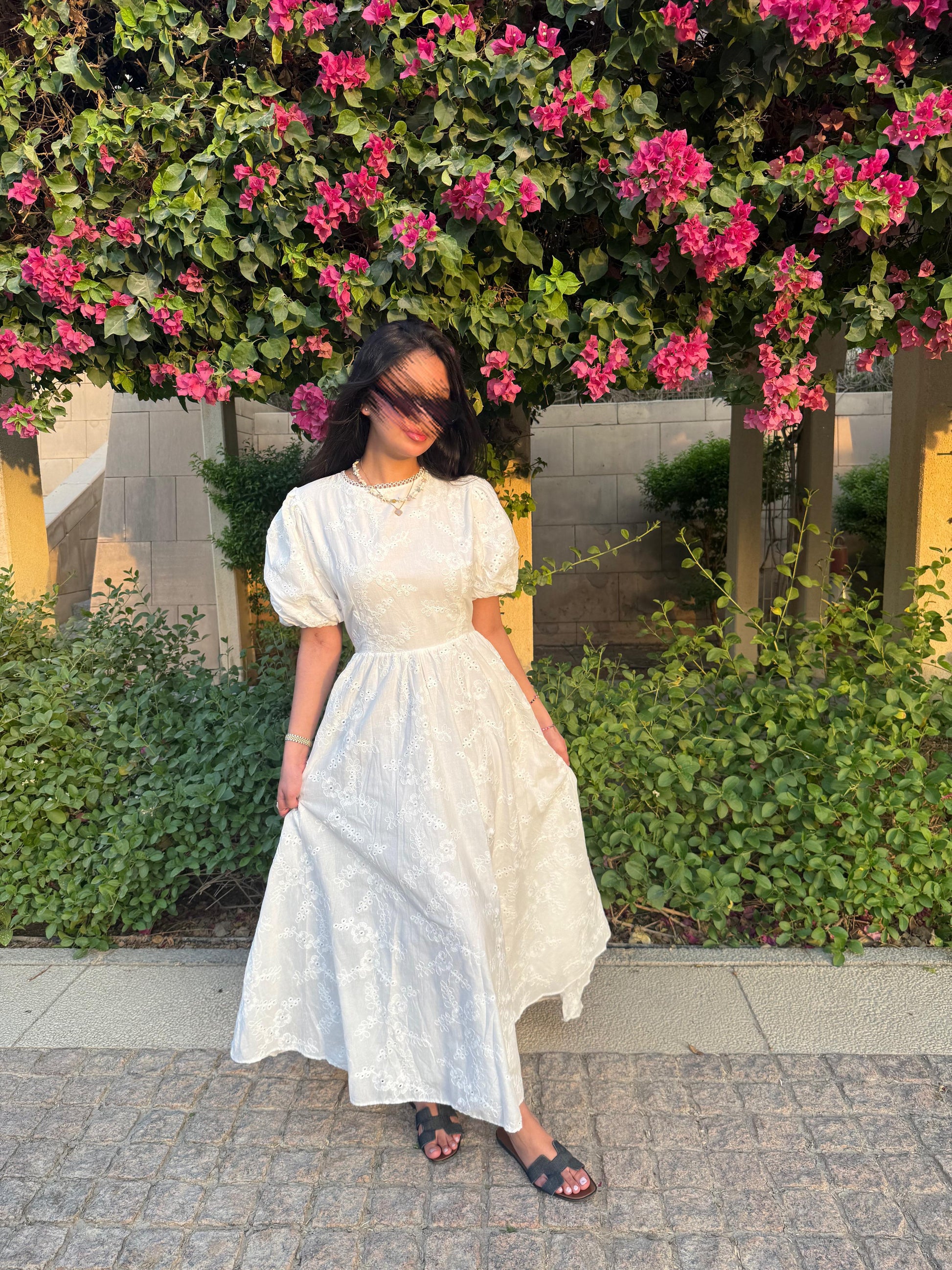 Soft Bloom is a white midi dress crafted from airy cotton with delicate floral embroidery throughout. Featuring short puff sleeves and a flowing silhouette, it’s a timeless piece made for lighthearted days and graceful movement.